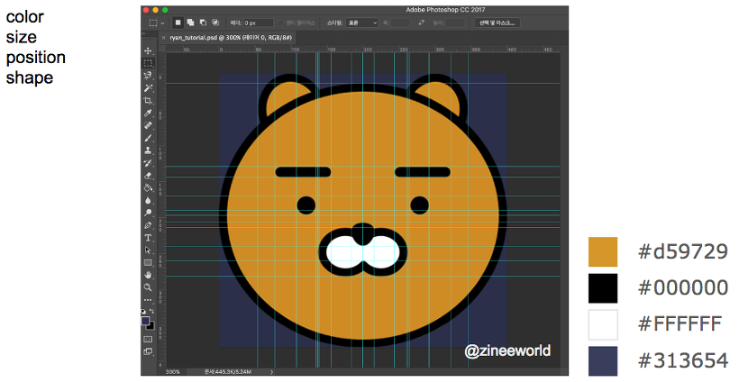 이 과정은 CSS로 작업하는 것 만큼이나 중요합니다. 포토샵을 사용하면 안내선으로 그리드를 칠 수 있습니다. 그러면 각 요소의 크기나 위치를 좀 더 정확히 알 수 있습니다. 단순한 캐릭터 일수록 비율이나 위치가 조금만 달라도 닮은 듯 안 닮은 결과물이 나오게 됩니다. 꼭 필요한 과정은 아니지만 이렇게 세밀하게 수치를 재서 만들면 완성도가 올라갑니다. 포토샵이 없다면 color picker를 이용해서 요소의 색상을 파악하면 됩니다.
