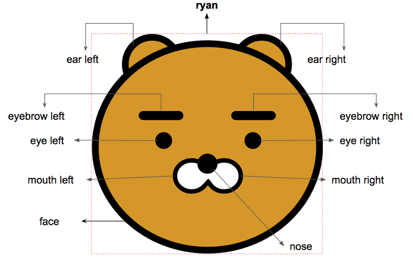 라이언을 구성하는 div 배치에서 중요한 것은 div.ear는 div.face 밖에 있다는 것입니다.